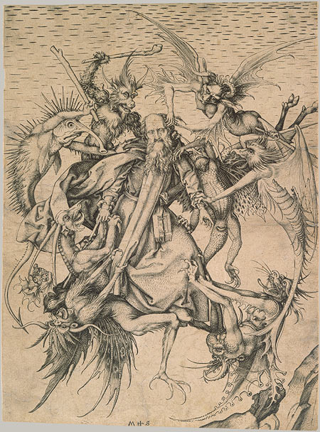 In this colorful excerpt from the Lives of the Artists, Italian biographer Giorgio Vasari provides an interesting detail of the early years of Michelangelo Buonarotti (1475-1564) as a painter: He used a contemporary engraving by the German artist Martin Schongauer (ca. 1445-1491) as the model for his first steps as a painter. The engraving is one of Schongauer’s earliest prints (he was around 30 when he made it) and depicts Saint Anthony tormented by the Demons.