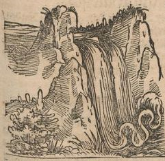Sebastian Münster (1488-1552) published the first edition of his Cosmographia in 1544. It was the first description of the world in German, and featured a cornucopia of illustrating woodcuts: maps, portraits,  plants and animals, not to forget the ubiquitous monsters. Although the description of the waterfall is rather precise, including the height of 12 “klafter” equaling roughtly 21 meters, the woodcut itself  is rather schematic, depicting the river as a tongue-like, solid shape.